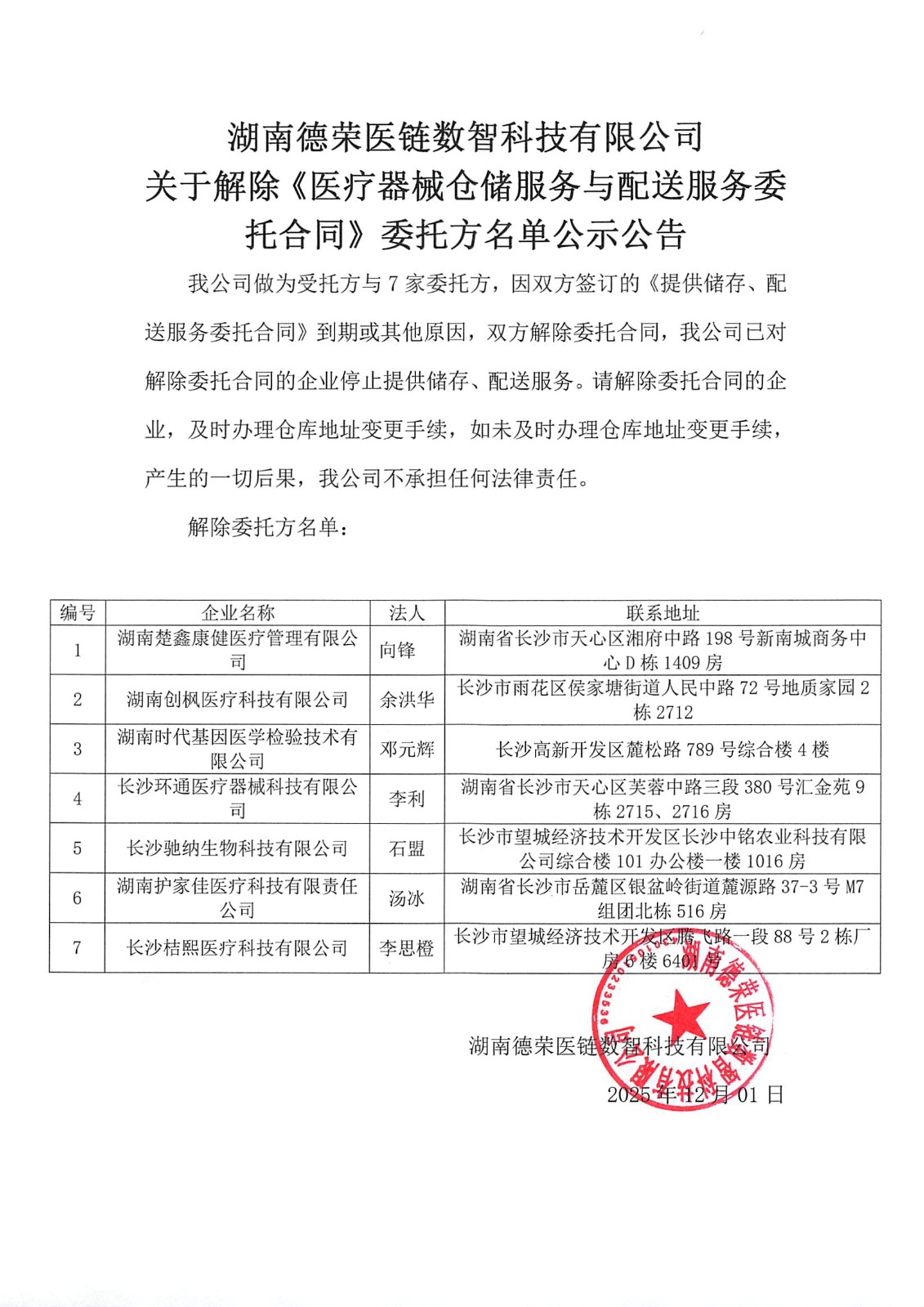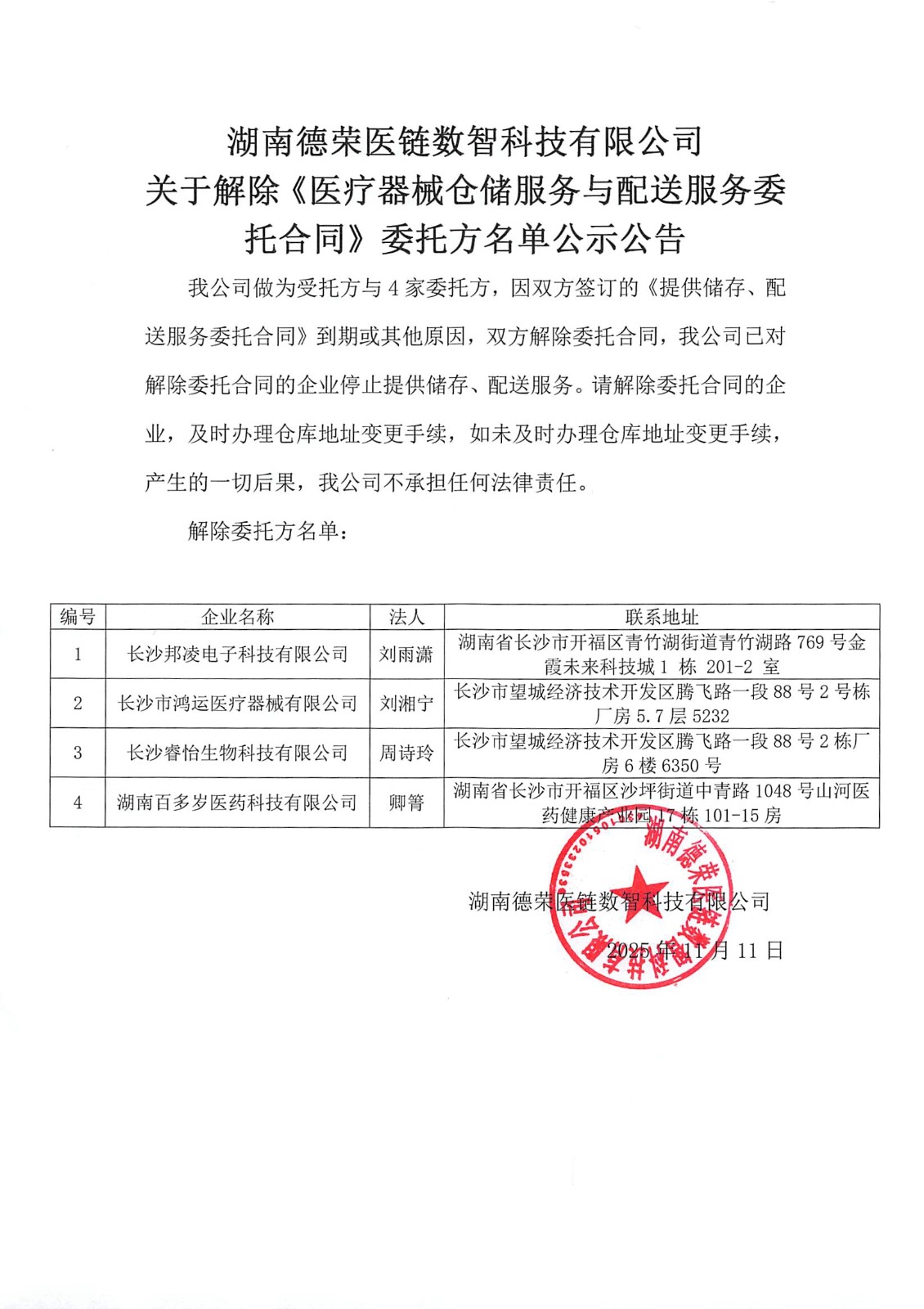 關(guān)于解除《醫(yī)療器械倉(cāng)儲(chǔ)服務(wù)與配送服務(wù)委托合同》委托方名單公示公告